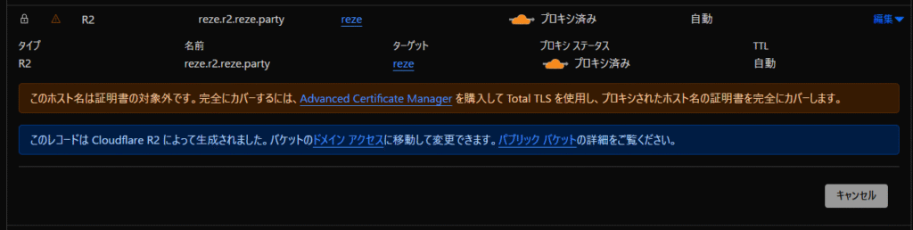このホスト名は証明書の対象外です。完全にカバーするには、Advanced Certificate Manager を購入して Total TLS を使用し、プロキシされたホスト名の証明書を完全にカバーします。