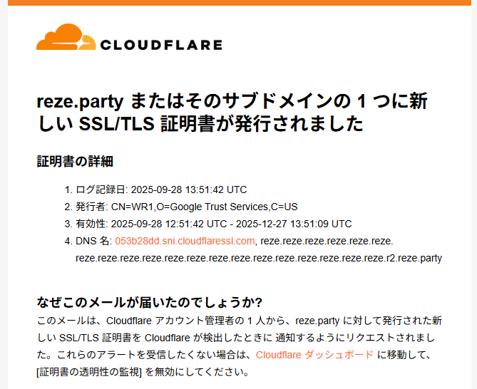 Certificate Transparency(CT)(証明書の透明性の監視)を有効にしていた場合、メールが届くため、新たに証明書が発行されていることが分かります。